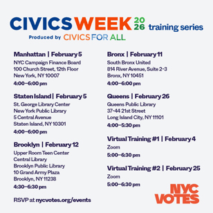 We're excited to join local students and educators across the city for Civics Week (March 9-13, 2026) to help young New Yorkers learn about local government, understand how elections work, and discover how to get involved.